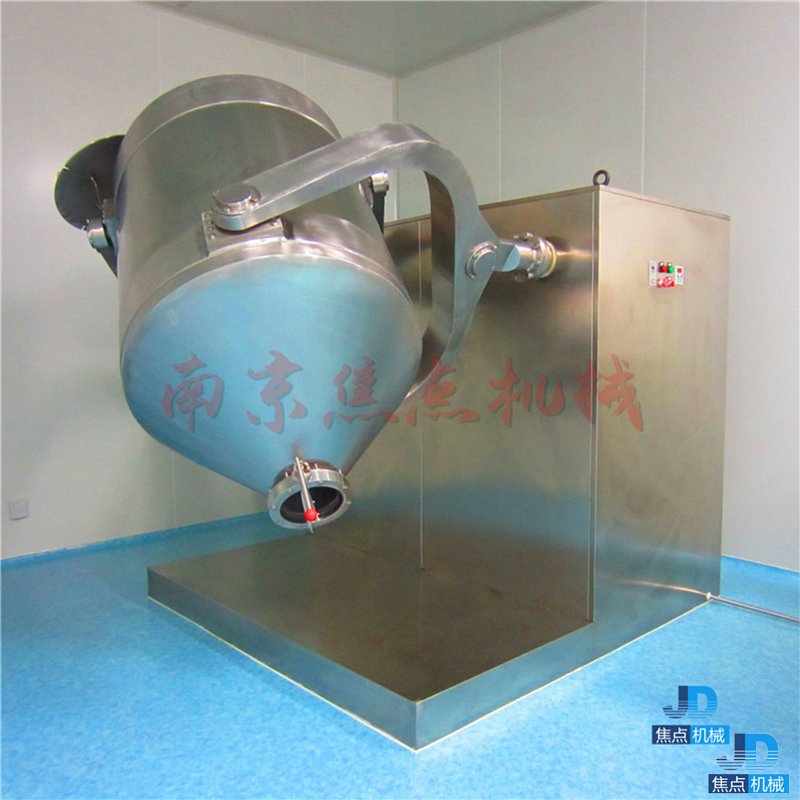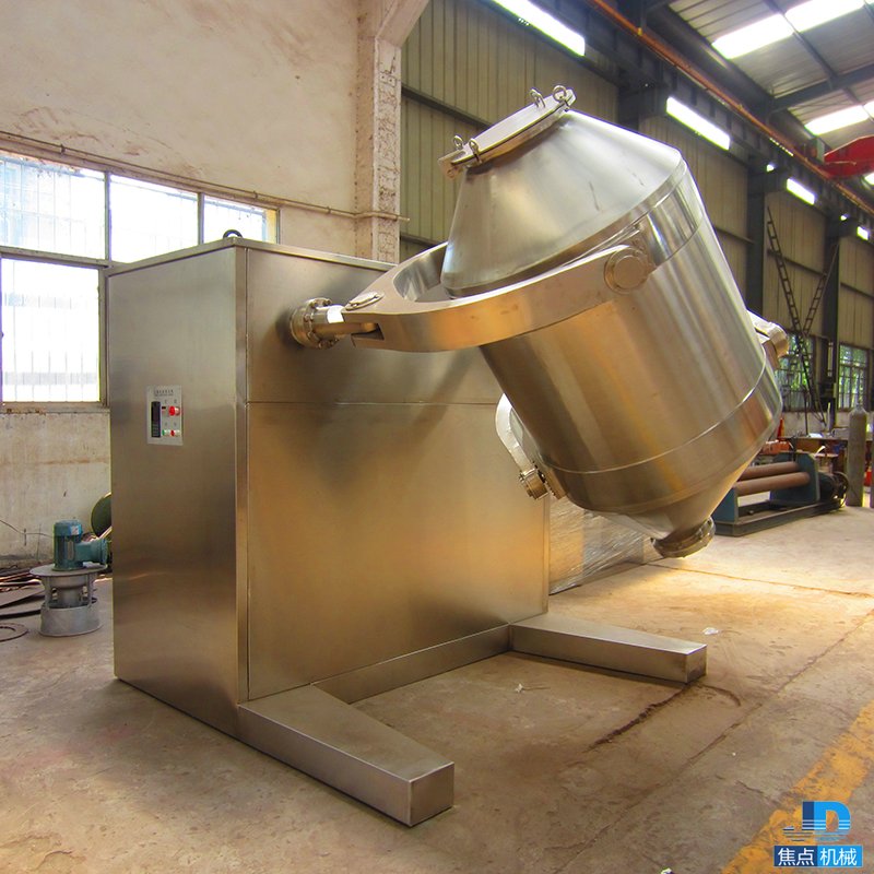 該機由機座、驅動系統(tǒng)、三維運動機構、混合筒,變頻調速電機,進料口出料口,電器控制系統(tǒng)等組成,與物料直接接觸的混合筒采用優(yōu)質不銹鋼材料制造,筒體內壁經(jīng)精密拋光。