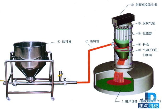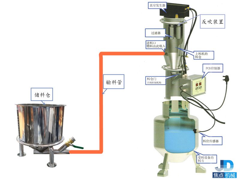 氣動(dòng)真空加料機(jī)由壓縮空氣真空發(fā)生器產(chǎn)生真空即負(fù)壓,這樣真空加料機(jī)將通過輸料管從儲(chǔ)料倉(cāng)中將物料吸入上料機(jī)料倉(cāng)內(nèi),再經(jīng)過過濾器將氣物分離,上料時(shí)間由PCB控制器決定,吸料結(jié)束,氣動(dòng)開閉機(jī)構(gòu)將料倉(cāng)門打開將物料放入相關(guān)的設(shè)備中,反吹裝置將反吹吸附在過濾器上的粉末,將粉末清除掉,然后再關(guān)閉料倉(cāng)門,下一個(gè)循環(huán)開始。如下圖: